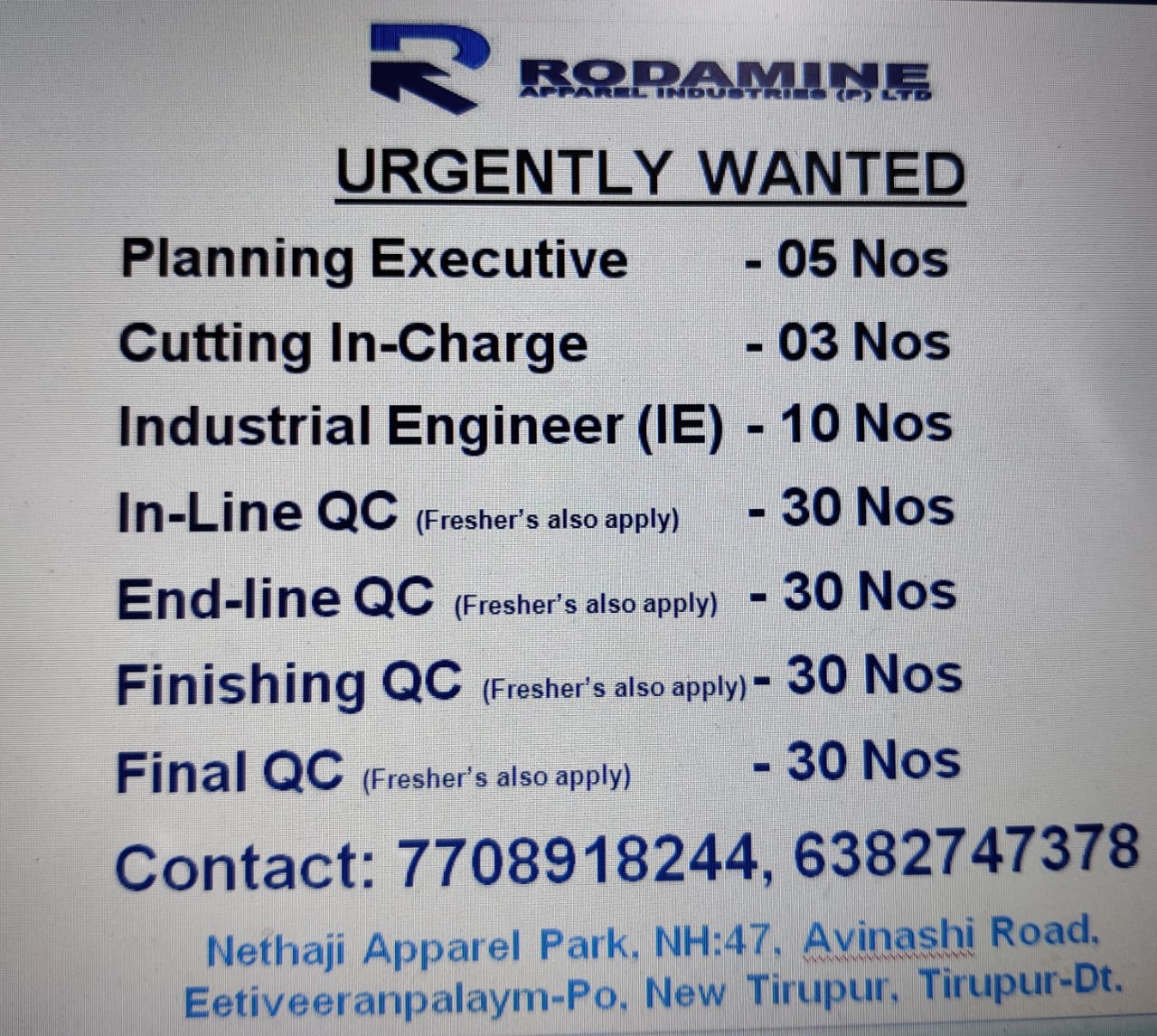 We have the following opening a reputed Leading Exports Garments Company Need following Candidates Urgent